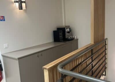 - Menuiserie sur mesure : Création et pose de mobiliers adaptés, notamment une banque d’accueil rétroéclairée.